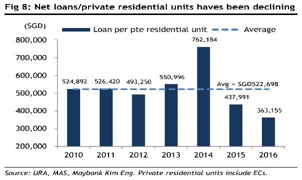 "Intuitively, the declining trend for loans per private residential unit over the past two years is consistent with lower property prices and a smaller residential unit size," Maybank Kim Eng said.