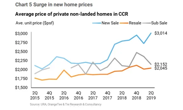 This chart from OrangeTee & Tie revealed that the average price of new condos in the Core Central Region (CCR) surged 10.5% from $2,728 per square foot (psf) in Q1 to $3,014 psf in Q2.