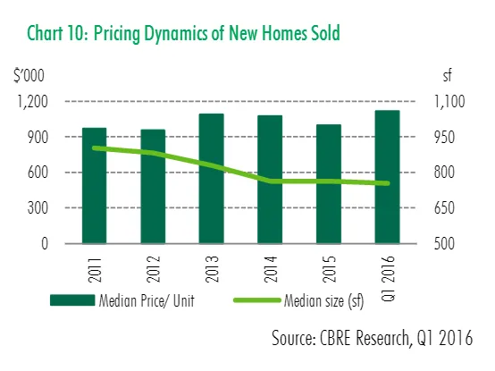 Meanwhile, the median size of new homes sold in Q! was 753 sg, slightly smaller than the 764 sf for homes sold in 2015.