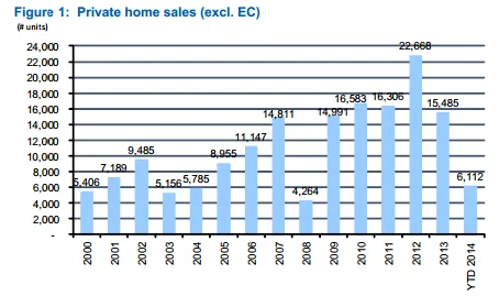 A report by OSK-DMG revealed that new home sales for Sep 2014 at 648 (excl. EC) were up 50% MoM but down 47.6% YoY vis-a-vis 437 units in Aug 14, 484 units in Jul 14 and 511 units in Jun 14. Year-to-date, 6,112 units (excl. EC) have been registered, down 52% YoY, and a far cry from the peaks levels attained in 2012 (only 27%).
