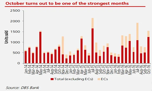 October 2016 sales volume up 87% YoY led by new launches as transaction volumes firming up to be stronger, DBS Group Research said.