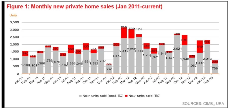 Only 261 new units were launched during the month compared to 2.2k units in Feb 2012. But the sell-through rate remained very strong at 3.5x of units launched in the month, an indication that the situation is not as bearish as suggested by the headline numbers.