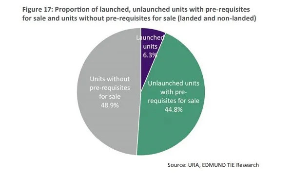 Out of the unlaunched units, 48.9% or 16,220 units have not obtained pre-requisites for sale, whilst the remaining 44.8% or 14,857 units are unlaunched units with pre-requisites for sale.