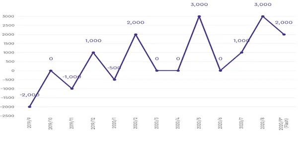 This chart released by the SRX shows that the overall median transaction over x-value (TOX) is positive $2,000 in September. This represents a $1,000 decrease from August.