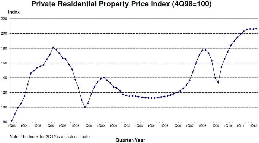 The overall private residential property index rose from 206.0 points in 1st Quarter 2012 to 206.8 points in 2nd Quarter 2012. This represents an increase of 0.4%, compared to the 0.1% decrease in the previous quarter. The pace of change in prices varied across the different market segments.