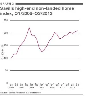 According to Savills data, the average unit price of luxury condos in Singapore was S$2,350 per sq ft in Q3/2012, a 2% rise QoQ from S$2,300 per sq ft, and a 9% increase year-on- year from S$2,156 per sq ft.