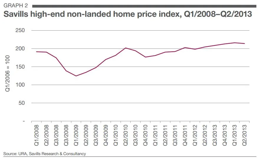 Savills said that according to the URA’s flash estimates for Q2/2013, the private residential property price index inched up by a modest 0.8% QoQ.