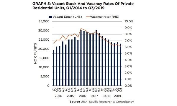 This chart from Savills Research & Consultancy shows that the vacancy rate of private homes improved by 0.3 ppt to 6.1%, the lowest in almost six years, at the end of Q3 2019. At the same time, vacant stock fell by 817 units to 22,819.