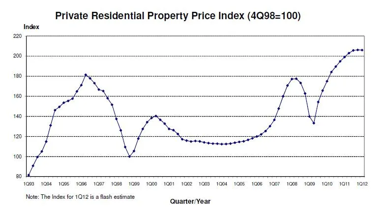 Compared to the quarter before however, URA's flash estimate of the private residential property price index for the 1Q12 indicates that overall private residential property prices have by a marginal 0.1% to 206 from 206.2. This is the first price decline since 2nd Quarter 2009 and follows the trend of stabilising prices over the past 9 consecutive quarters.