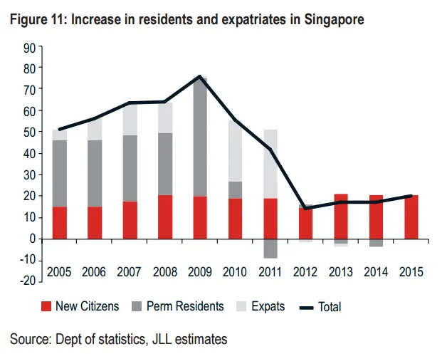 This chart shows that the number of new residents has dropped steeply since the government began reducing immigration in 2012. Home demand from expats and permanent residents has dried up as a result.