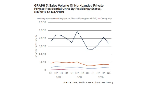 This chart from Savills shows that permanent residents (PRs) and foreigners bought a total of 970 condominiums and private apartments in Q4 2019.