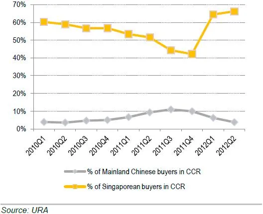 Mainland Chinese buyers had accounted for as much as 11% of the transactions in the Core Central Region (CCR) before the introduction of the ABSD, after which it declined to about 4% in 2Q12.