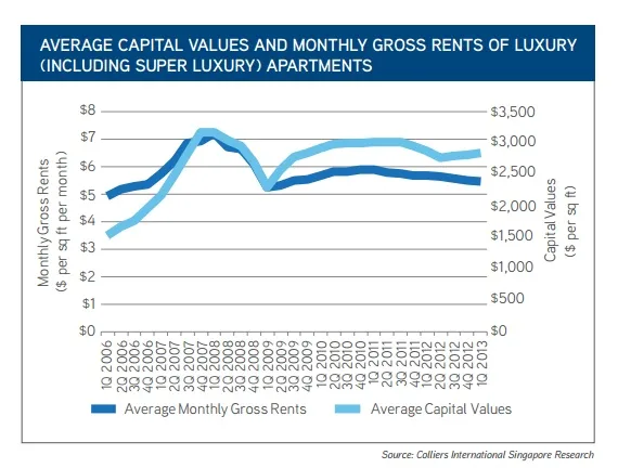According to Colliers International, mitigated by the strong holding power of high net-worth landlords, its research showed that rents of luxury and super-luxury homes slipped only marginally, by 0.7% QoQ to $5.45 per sq ft per month as of the end of March 2013.