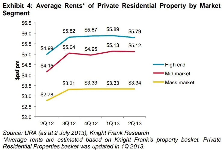 Knight Frank’s analysis of its property basket showed average rents of high-end and mid-market homes fell by 1.8 per cent and 0.2 per cent q-o-q to $5.79 and $5.12 per sq ft per month, respectively, in 2Q 2013.
