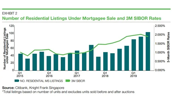 In Q3, the 3M-SIBOR rate declined for the first time since Q1 2018, lowering from 2.002% in June 2019 to 1.877% in September. Growth in interest rates are generally correlated to higher mortgagee sale listings.