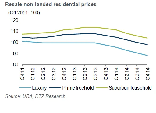 Data from DTZ show that prices of resale condominiums dropped by close to 10% in 2014, on back of a 30% plunge in transaction volumes.