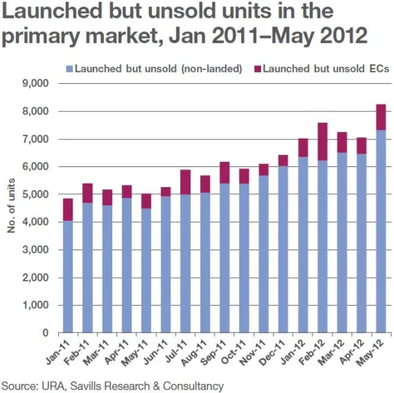 As supply outstripped demand, the number of launched but unsold units picked-up, reaching an historical high of 8,245 units (including 933 ECs) in May. With more projects planned for launch in the second half of this year, the number of launched but unsold units is poised to hit a record high in 2012.