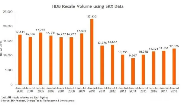 This chart from SRX Analyzer and OrangeTee & Tie Consultancy showed how HDB flats’ resale volume recovered progressively from 2015 to 2018.