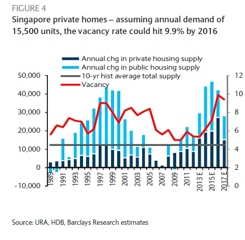 According to Barclays Research, “We believe this is testament to the looming oversupply in 2015-2017 as the government reiterated the reduced future supply will be ‘added to the existing large pipeline supply of more than 90,000 private residential units (including ECs)’.”