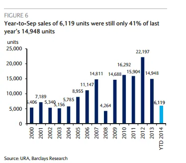 Barclays sees a similar trend for October; with a sequentially higher sales figure on a major launch - Marina One Residences but weak sell-through rates, reflecting risk of rising unsold inventory in the system.