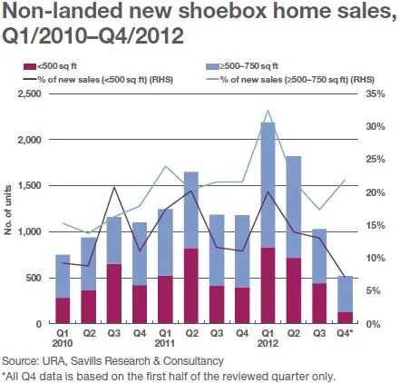The proportion of these shoebox units to total new condo sales has fallen from a three-year peak of 21% in Q3/2011 to a low of 7% in Q4 this year. This is also below the three-year average of 14%.