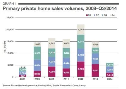 According to URA’s statistics for the third quarter of 2014, the number of new private residential units sold fell by 42.6% QoQ, to 1,531 units from 2,665 in Q2. Major projects launched in Q3 included City Gate, Highline Residences and Seventy Saint Patrick’s, which achieved take-up rates of 59.3% (89 out of 150 units), 88.8% (142 out of 160 units) and 78.6% (110 out of 140 units) respectively within their first month of launch.