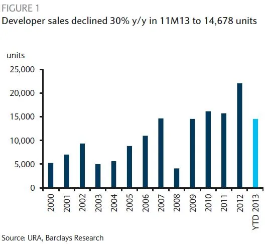 Developer sales fell 30% y/y in the 11 months to November 2013 to 14,678 units from 20,880 units sold in 11M12. We expect December volumes to have declined sequentially, resulting in full-year sales of 15,500 units in 2013 (-30% y/y).