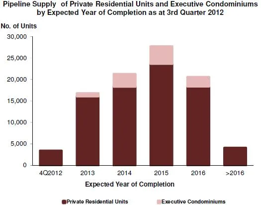 As at the end of 3rd Quarter 2012, there was a total supply of 83,975 uncompleted private residential units from projects in the pipeline, higher than the 83,251 units in 2nd Quarter 2012. Of the supply in the pipeline, 36,606 units remained unsold as at 3rd Quarter 2012.