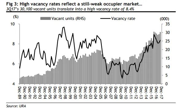 This chart from Maybank Kim Eng shows the rise in Singapore's vacancy rate to 8.4% still puts residential rents under pressure.