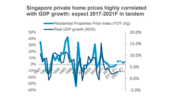 Historically, Singapore's private home prices have a strong correlation with GDP growth.