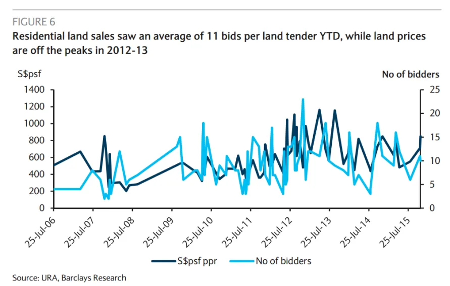 This chart from Barclays shows that land sales remain robust this year despite Singapore’s prevailing property cooling measures.