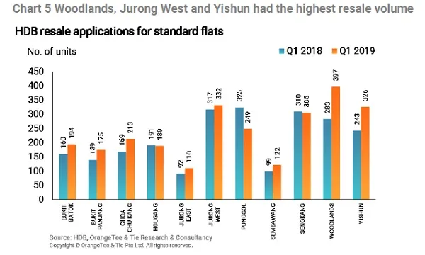 This chart from OrangeTee&Tie showed that amongst non-mature estates, HDB resale applications for standard flats in Woodlands surged the most by 40.3% QoQ in Q1 to 397 from 283 in 2018.