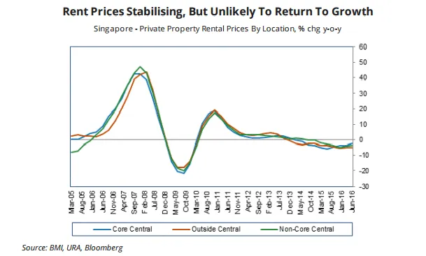 And though the rate of contraction has slipped by a margin, rental prices for residential properties continue to fall in YoY terms. BMI Research also pointed out that for non-core central properties, rental prices also tumbled in QoQ terms.