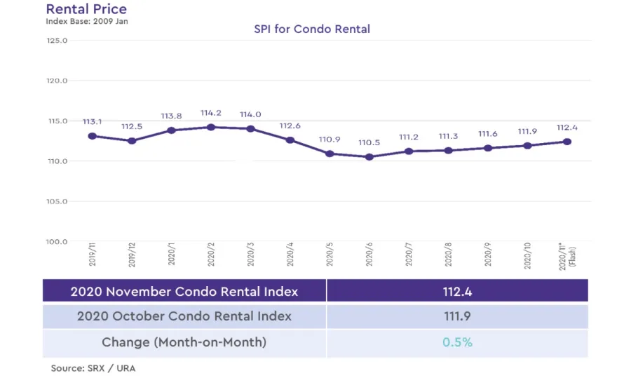 An estimated 1,762 flats were rented in November 2020, an increase of 6.7% from the 1,652 units in October 2020. However, this is 11.7% YoY lower than volumes recorded in November 2019.
