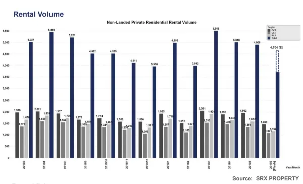 HDB rental volumes edged up 1.2% YoY in June with an estimated 1,878 HDB flats rented. MoM, rentals were down 3.1% compared to the 1,938 seen in May.