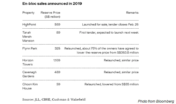 Of the six en-bloc sales announced so far in 2019, the properties at Horizon Towers, Cavenagh Gardens and Flynn Park are being relaunched with around 75% of Flynn Park owners agreeing to lower the reserve price from $363.8m to $325m in the hopes of closing a sale.