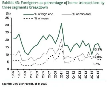 By sub-segment breakdown, homes transacted by foreigners in 1Q15 accounted for 13.3% of high-end segment, down from 17.4% a year ago (in 1Q14). Similar trend happened in mid-end (6.0%, down from 8.5%) and mass market (6.7%, down from 11.5%) segments.