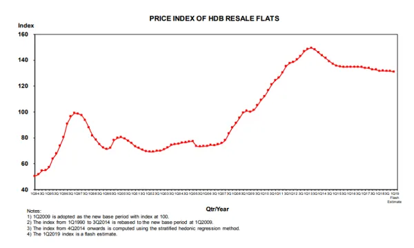 Housing and Development Board’s (HDB) resale flat prices dipped 0.3% QoQ to 131 in Q1 2019, according to its flash estimate of the Q1 2019 Resale Price Index (RPI).