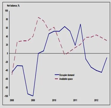 Occupier demand continued to fall at a much slower rate than seen previously, with the net balance moving notably to -10 from -44, said RICS survey.