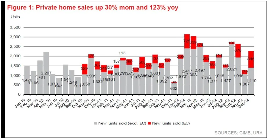 According to CIMB, Dec sales rebounded after dipping in Nov, led by demand for executive condominiums (EC) and investment demand. This brings the 2012 tally to 27,191 units sold, up 41% from 2011. Friday’s policy measures should dent volumes in the next few months.