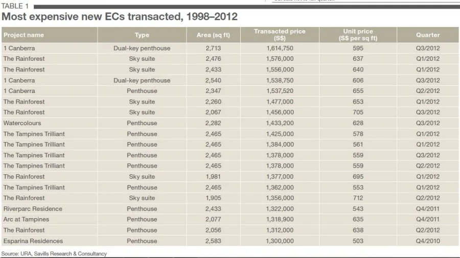 According to Savills 'Market in Minutes' report, while the average price quantum for all new ECs was S$822,000 in Q2/2012, more EC units have breached the S$1 million dollar mark in recent months.