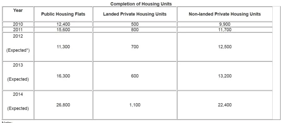 In a written response by the Ministry of National Development to queries by Mr Gan Thiam Poh, it was revealed that 22,400 units will be completed as compared with the expected 12,500 non-landed homes by end-2012. Click the image on the right to view the full table of completion of housing units.