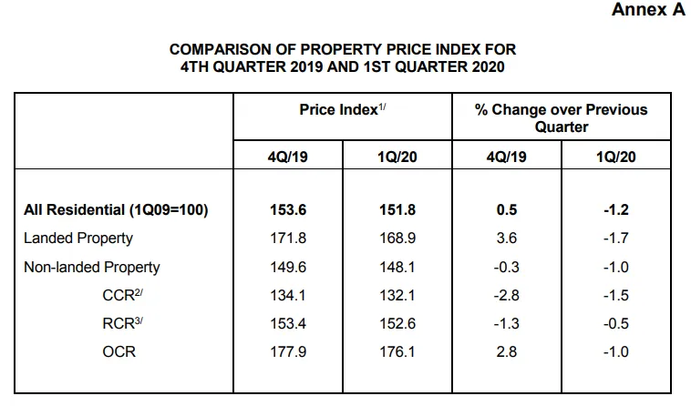 “As economic and employment conditions were not dire in 1Q 2020, sellers of completed homes in the mass market and landed segment most likely opt to accept lower profits in a bid to offload their property, pushing the price index down,” Lee said.