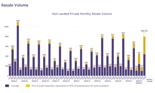 The volume of private condo resales leapt 32.2% to 882 units in July from the 667 units transacted in June, SRX Property revealed. On a YoY basis, volumes dipped 19.8% after the market recovered from “unusually high activity” ahead of the introduction of cooling measures.