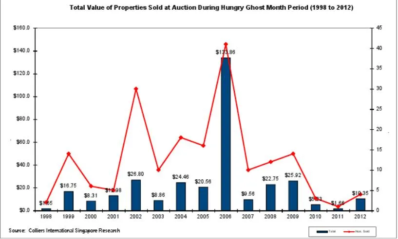 According to Colliers International, 4 properties with a total sale value of S$10.35 million were sold at property auctions during the Hungry Ghost Month period, which falls between 17 August and 15.