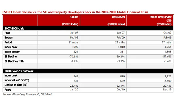 Such movements mimic the share price carnage seen during the 2007-2008 Global Financial Crisis (GFC). Looking back, S-REITs plunged by 70.6% in this period, which is similar to the 69.2% retreat for the developers’ index of FSTREH – both underperforming the 57.6% drop in the STI Index. The drop is more gradual and over a longer period of 21 months compared to the STI Index’s 17-month decline.