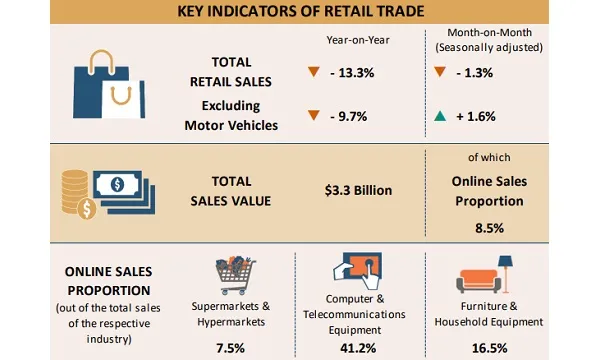 Retail sales slipped 13.3% YoY in March to $3.3b as domestic consumption and tourist arrivals continue to be bleak, according to data from the Department of Statistics (SingStat). Excluding motor vehicles, retail sales fell 9.7% over the same period.