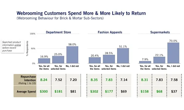 Customers of department stores with webrooming behaviour spent $229 on average, whereas those that did not do online research spent around $81, a poll by Singapore Management University (SMU) revealed. This refers to customers who did online research for a product they want to buy before walking in a physical brick-and-mortar store for it.