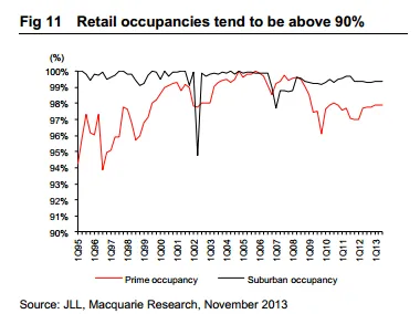 According to Macquarie Research, retail rents and occupancies should remain resilient in 2014, underpinned by an improved macroeconomic environment and retail sales.