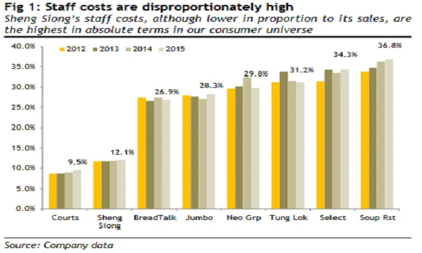 Staff costs eat up 26.9% of BreadTalk's revenue. For Sheng Siong and Courts, staff costs take up 12.1% and 9.5% of revenue, respectively.